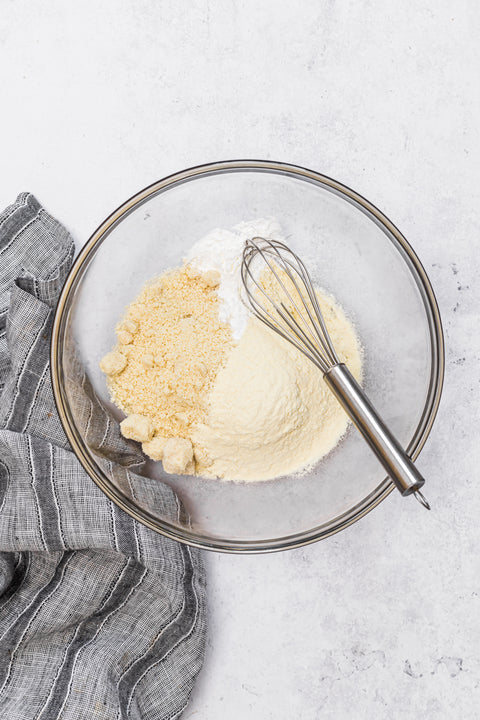 In a large bowl, mix together the almond flour, protein powder and baking powder.